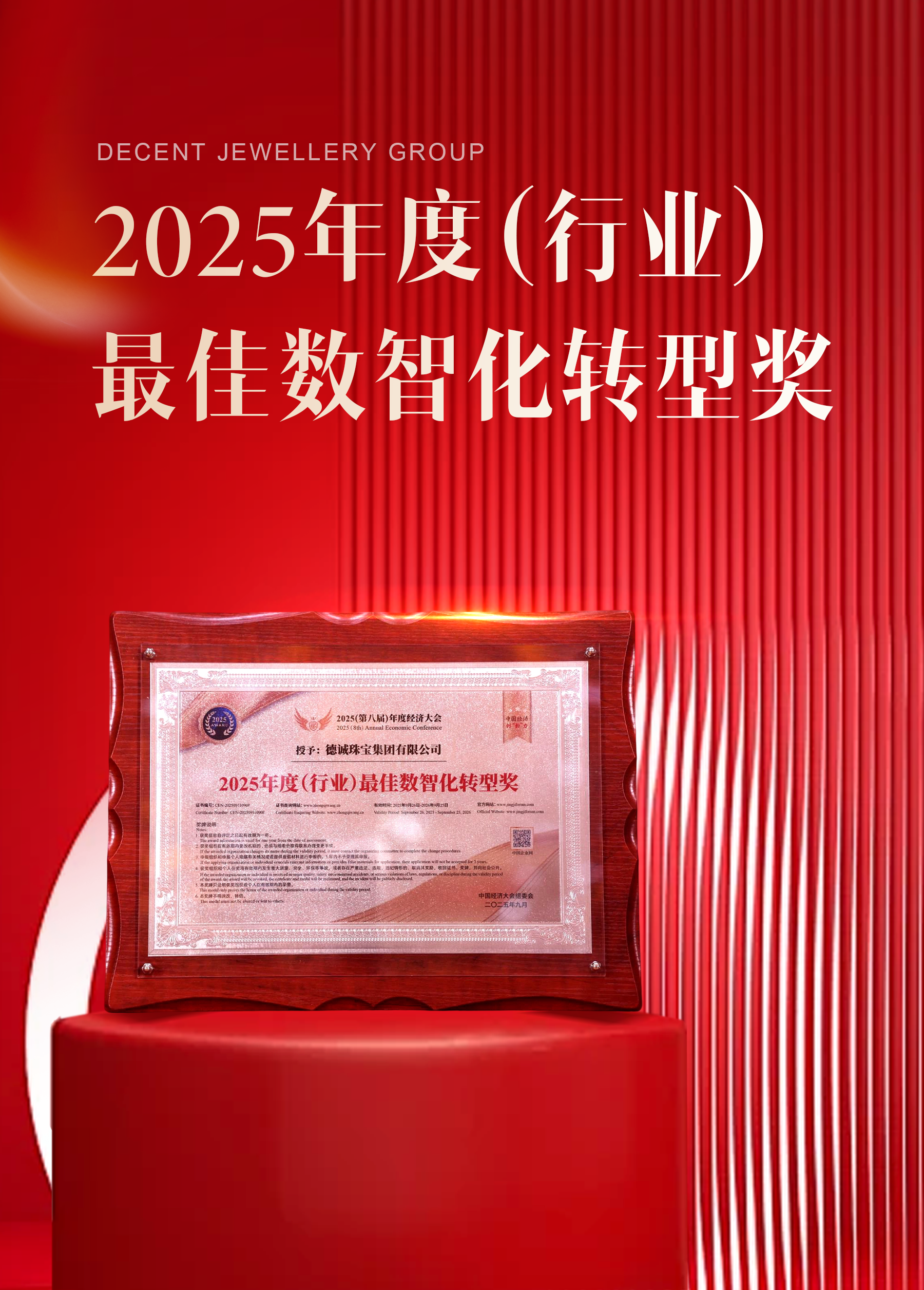 自国家提出并大力推进“新质生产力”发展这一战略方向以来,各行各业纷纷加快转型升级步伐,以数智创新驱动产业变革,积极构建现代化产业体系。在此背景下,本次年度经济大会通过系统梳理年度经济大事件,并对在经济社会各领域中作出突出贡献的行业典范予以表彰,传递时代精神,致敬向上力量。德诚珠宝集团凭借其在数智化战略方面的系统性成果与行业影响力,从众多企业中脱颖而出,斩获“2025年度(行业)最佳数智化转型奖”。此次摘得殊荣,不仅是对集团过往创新实践与战略定力的高度肯定,更是对其在珠宝行业深耕细作、勇于变革的有力见证。